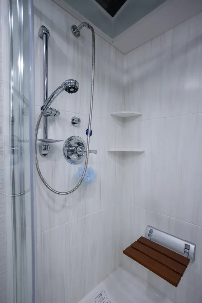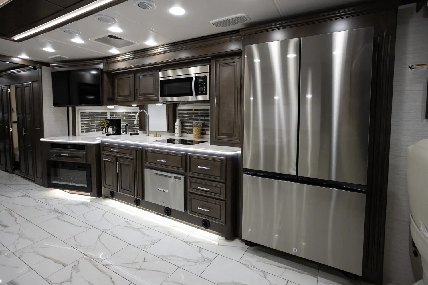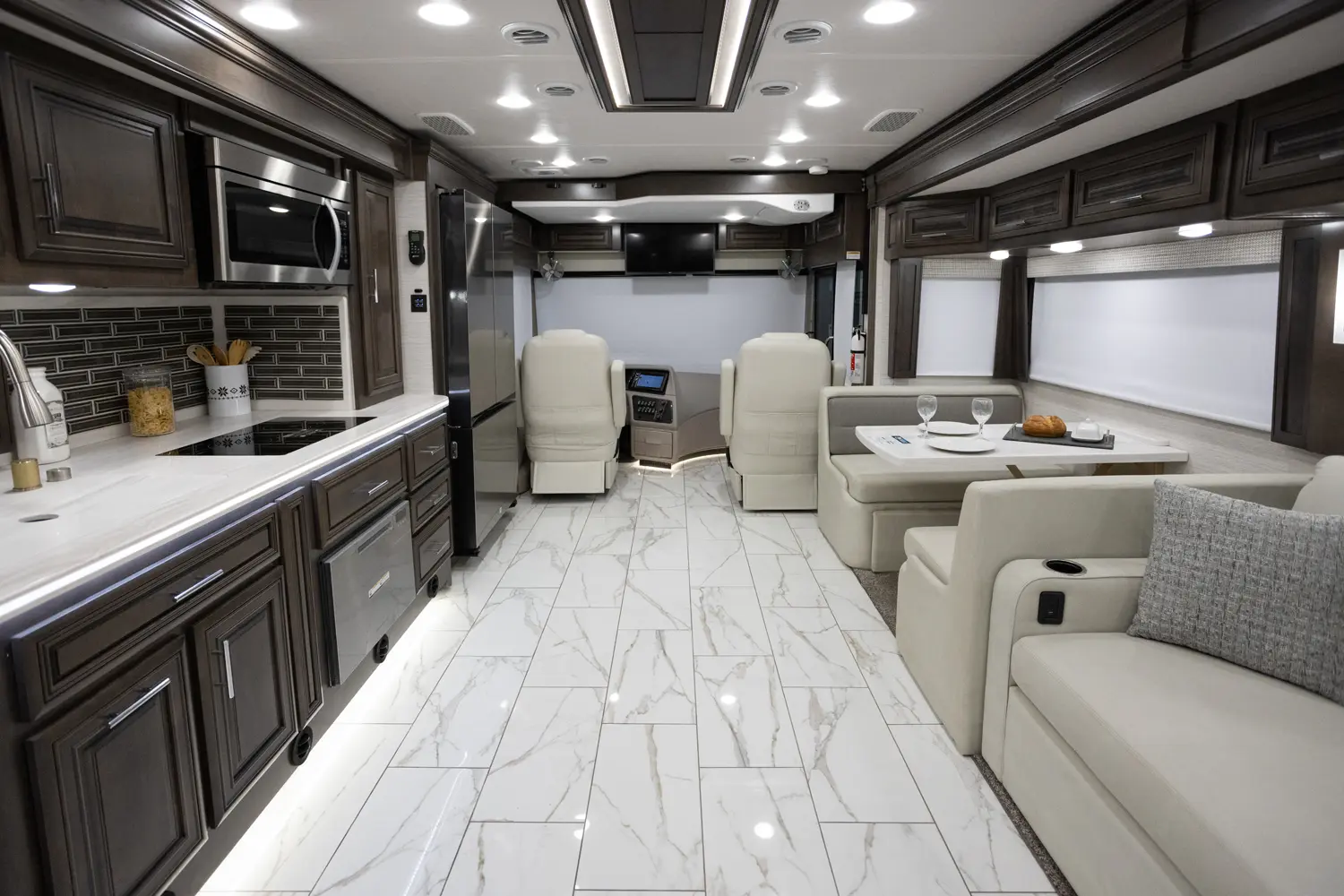 The Berkshire XLT 45A is a four-slide bunkhouse model with two full bathrooms. The rear large full bath includes a shower, vanity with dual sinks, overhead cabinets, and stacking washer/dryer. The main bedroom has a slideout, 72" x 80" Tilt-a-View king bed, plus a dresser, wardrobe cabinet, 43" TV, and overhead cupboards. The second full bath has a shower, vanity sink, medicine cabinet, and commode. Across across from this bathroom is the bunk room/wardrobe combo. The kitchen provides a convection microwave, induction cooktop, and residential-style refrigerator. Just over the cockpit, you'll find a unique drop-down bed that provides an additional sleeping surface at night.