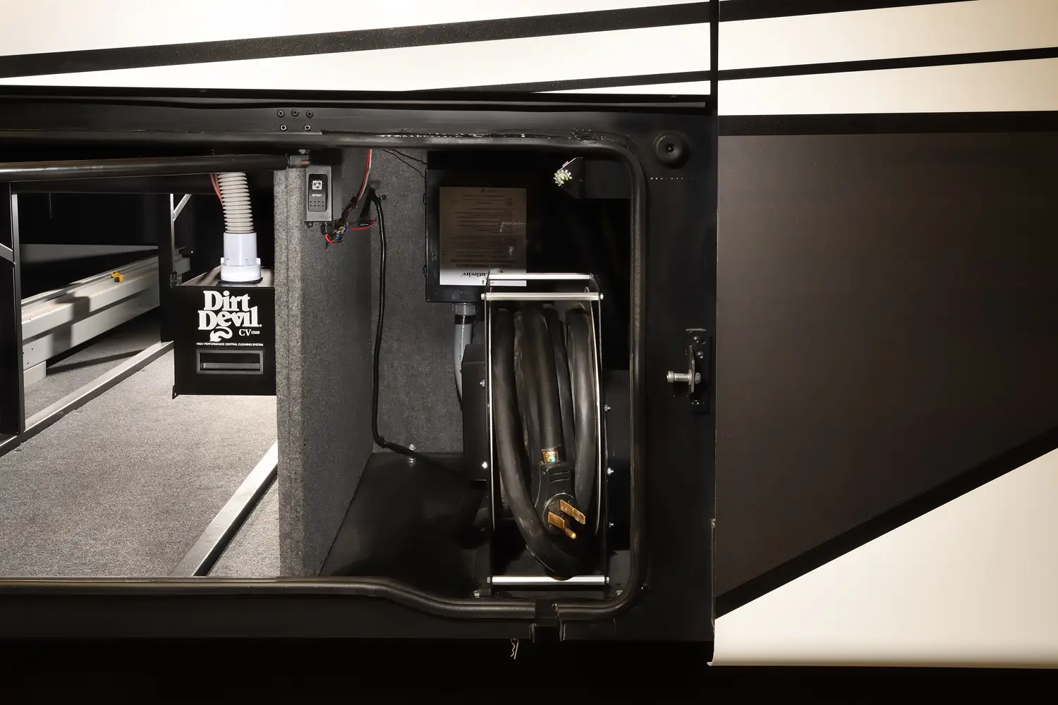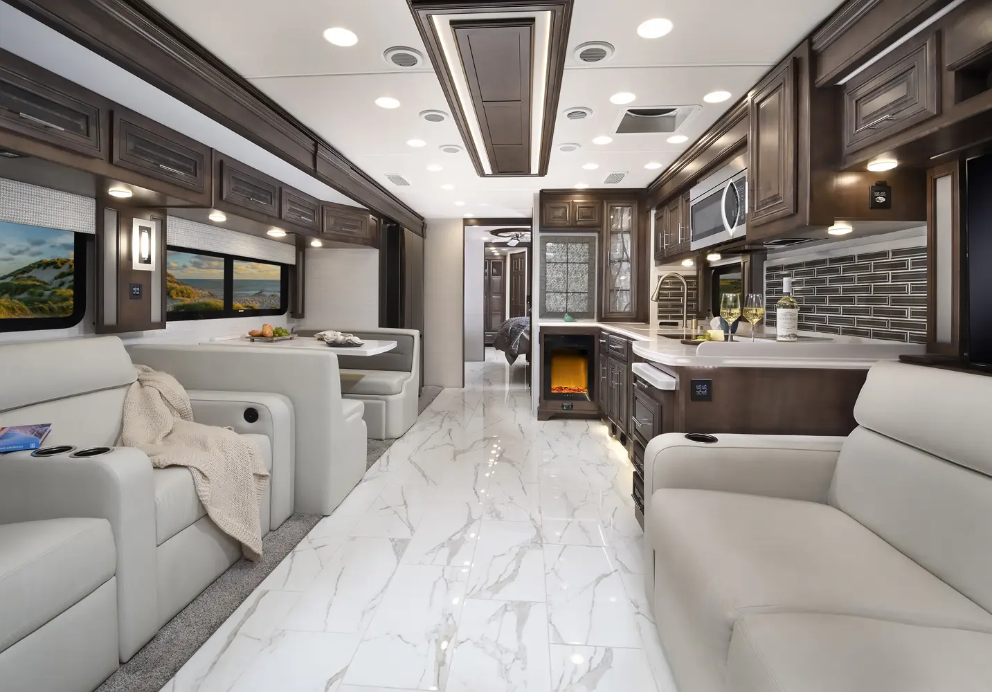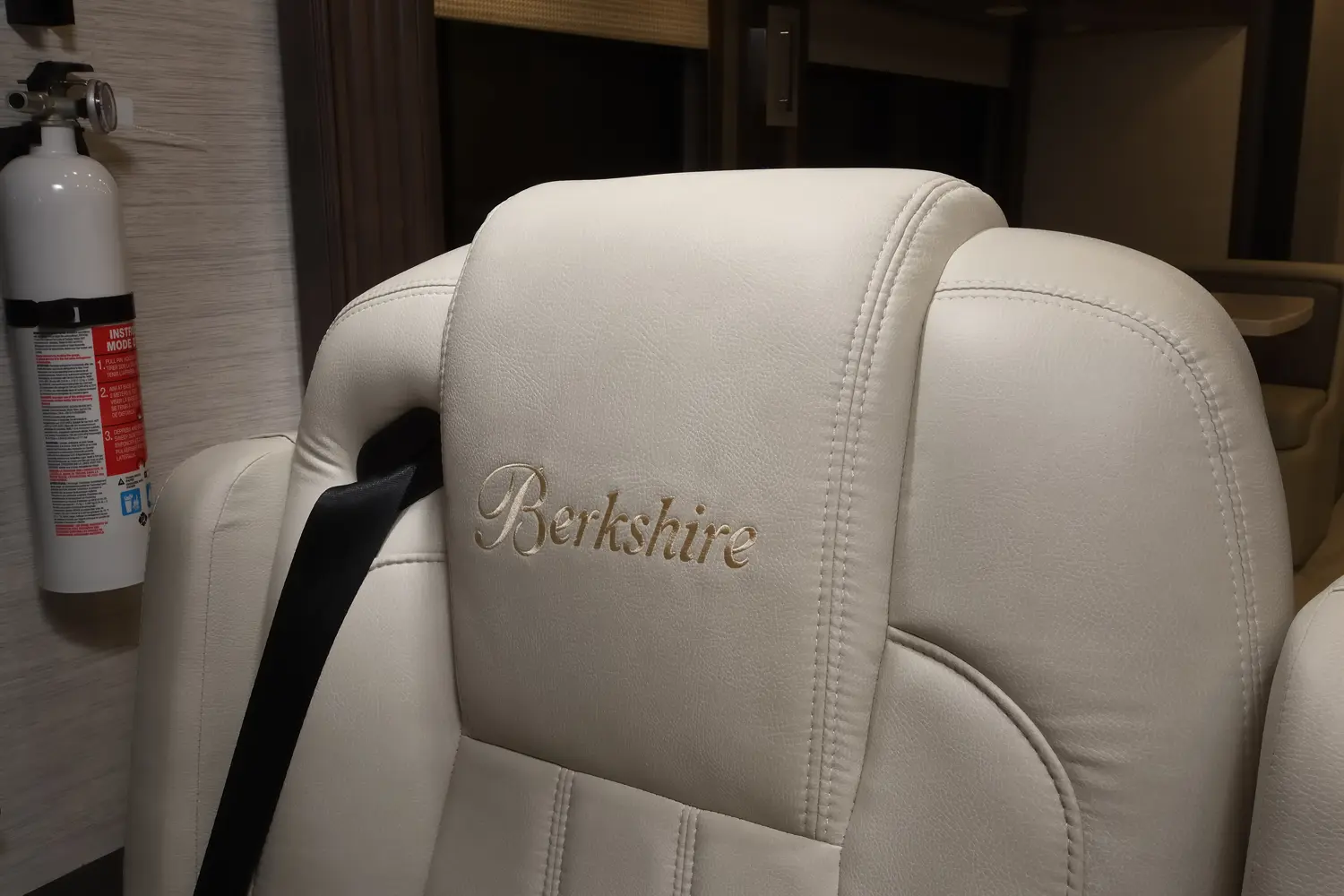 The Berkshire XLT 45E is a five-slide bunkhouse model. The large full rear bath includes a shower, vanity, cabinets, and stacking washer/dryer. Within the bathroom is a slideout bunk room/wardrobe combo. Each bunk is 30" x 73" and has its own TV. The main bedroom has a slideout, 72" x 80" Tilt-a-View king bed, plus a dresser, wardrobe cabinet, 43" TV, and overhead cupboards. Moving toward the living area is a half bath with vanity sink, medicine cabinet, and commode. The kitchen is fully equipped with a convection microwave, induction cooktop, and residential-style refrigerator. Just over the cockpit, you'll find a unique drop-down bed that provides an additional sleeping surface.