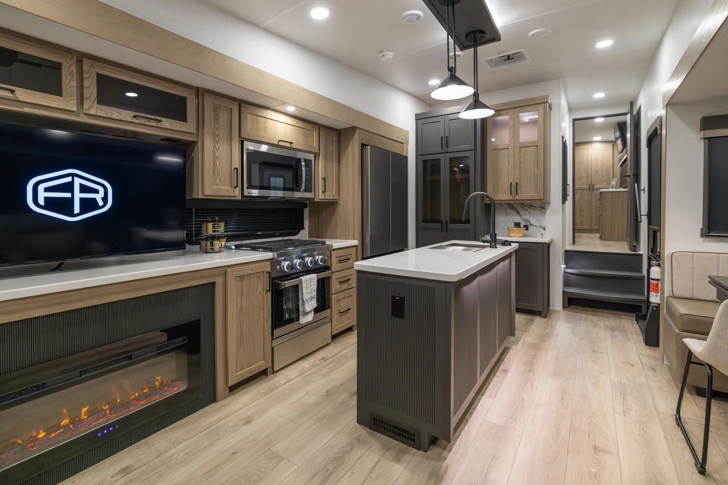 This elegant rear living unit offers a 76" hide-a-bed sofa, 60" theater seating, and a fireplace with TV for ultimate relaxation. The kitchen features an island, pantry, and ample counter space, while the dining area includes a table with chairs and bench seating. The front bedroom boasts a king bed, washer/dryer prep, dresser, and wardrobe storage. With dual awnings and pass-thru storage, it’s built for comfort and convenience.