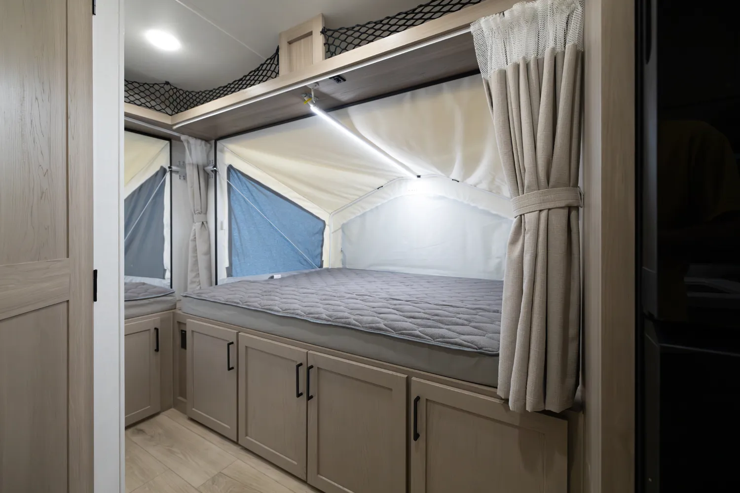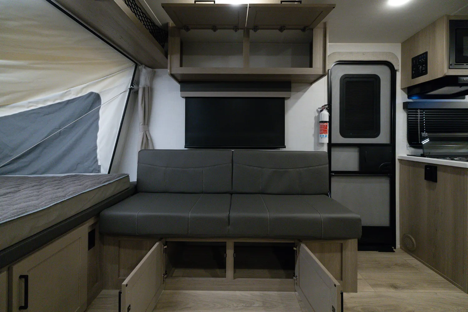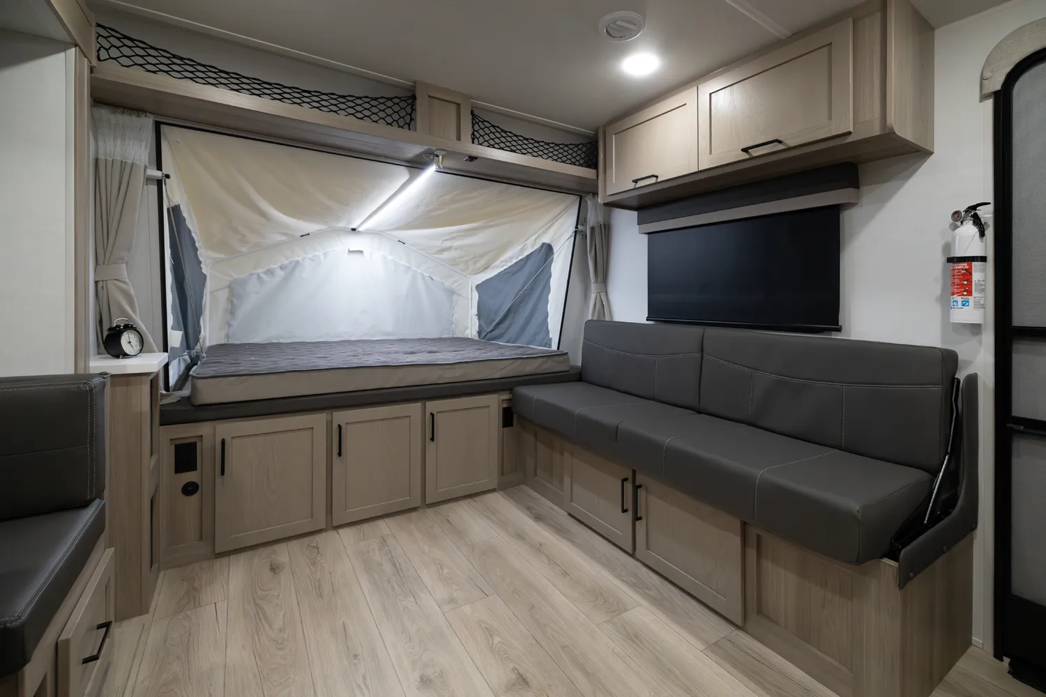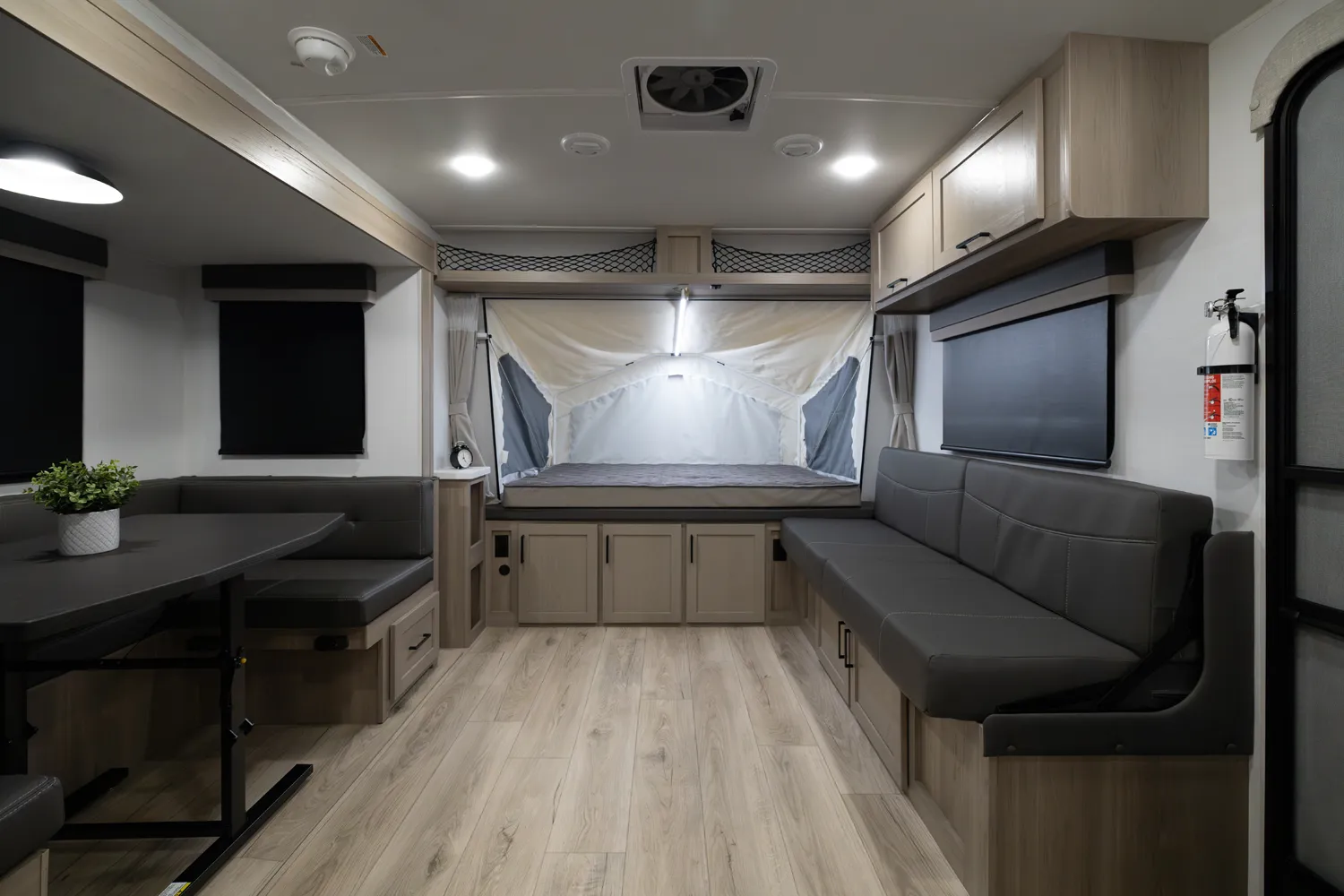 This incredibly popular floor plan has three bed expendables and one slide out featuring a large U-Shaped Dinette. All three expandable beds are residential Queen 60 x 80 beds. There is also sleeping on the 44 x 85 U-Shaped dinette and on the 67” flip out sofa. With the potential to sleep 10 people in a coach that weighs just over 5,000lb, this is a truly unique floor plan.