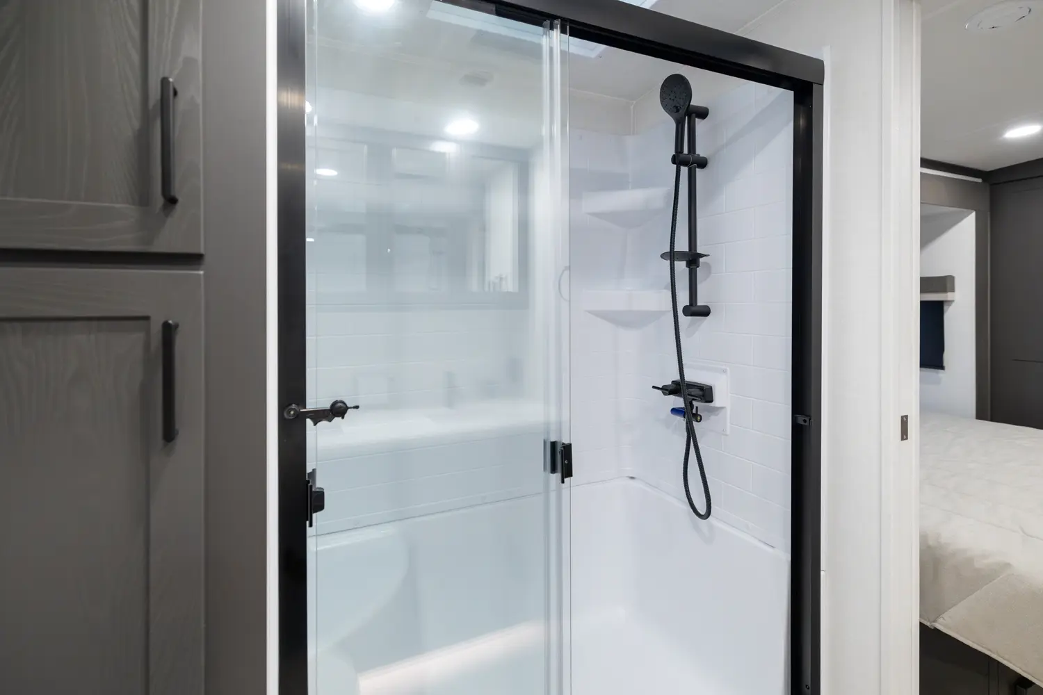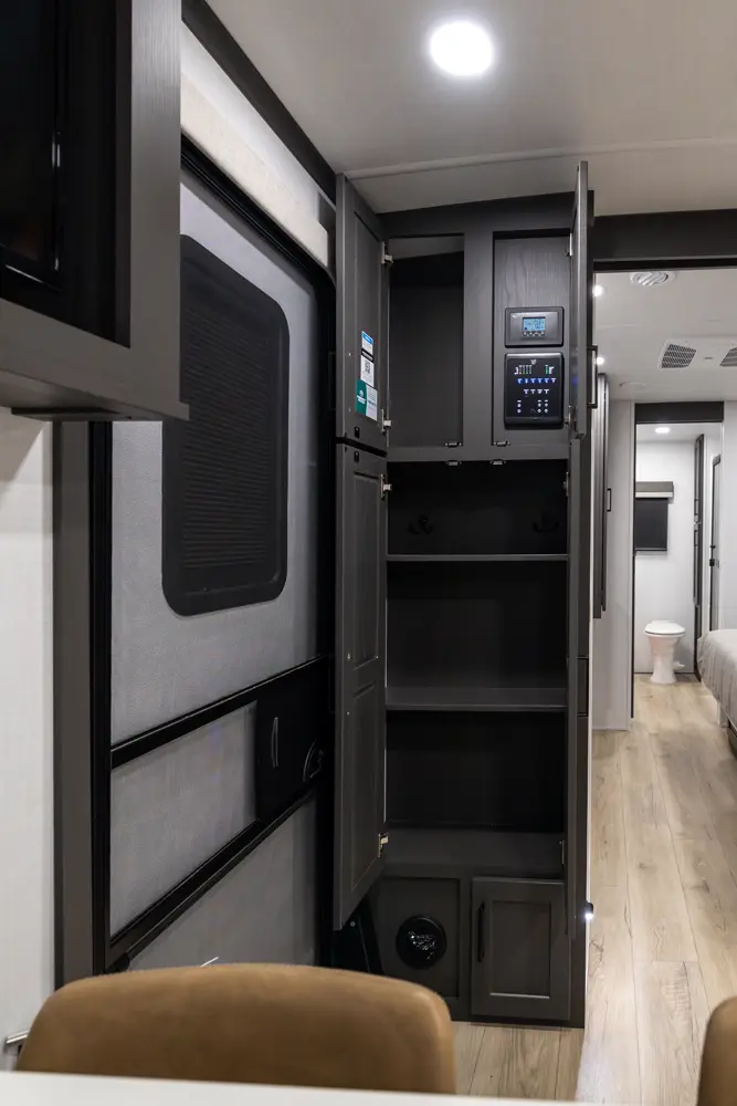 EXQUISITE, EXPANSIVE INTERIORS AS THE NORM. WELCOME TO THE SIGNATURE SERIES, REDEFINING THE CAMPING EXPERIENCE THROUGH AN ARRAY OF REMARKABLE FEATURES. With its inviting open floorplans and ample storage capacity, there's room for those cherished guests or family you wish to bring along. As you nestle into the embrace of a plush king or queen sized bed, the restlessness of your adventures fade away. Through its efficient layout and panoramic windows, the Signature travel trailers offer you an opportunity to luxuriate in your surroundings, all while enjoying the comfort of your serene interior.