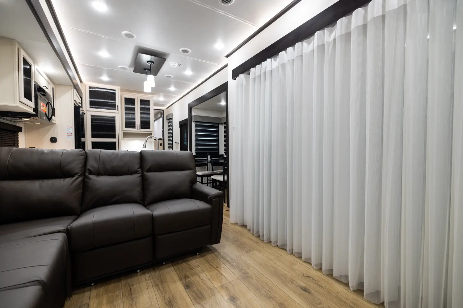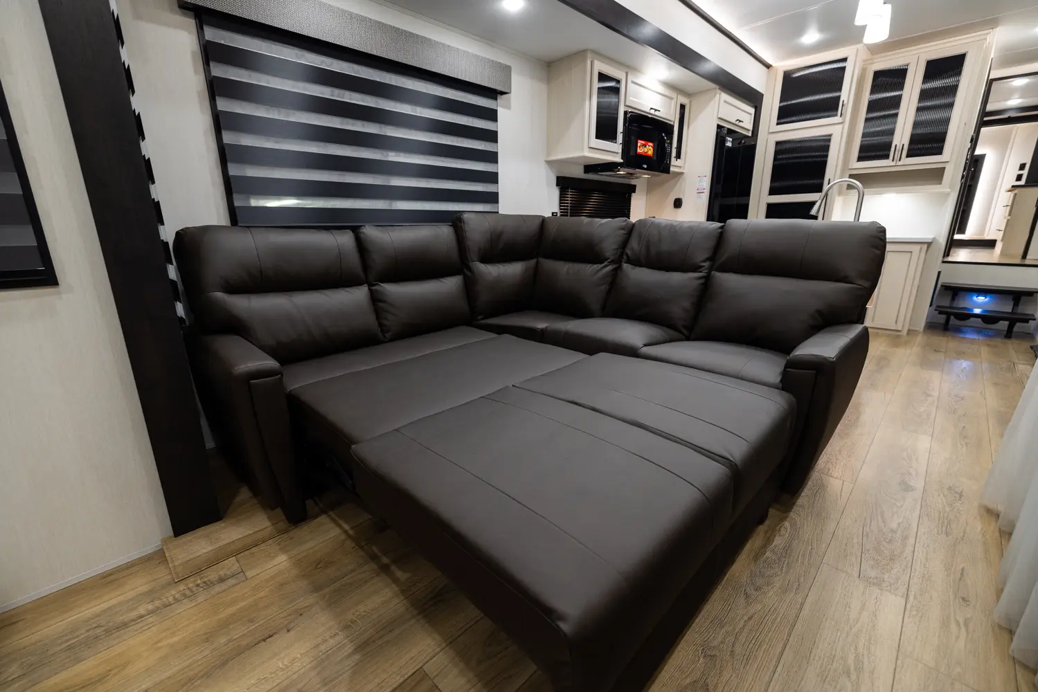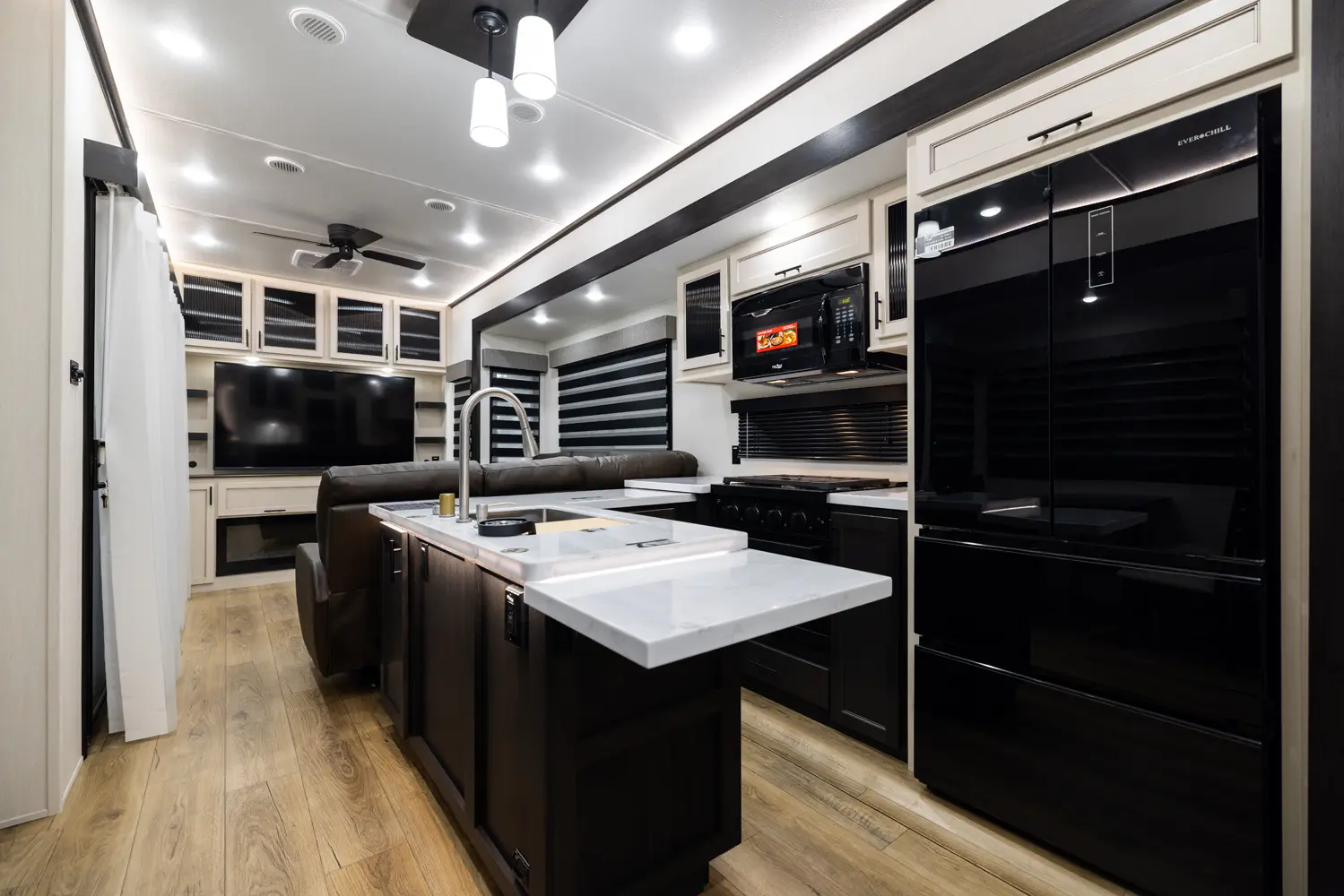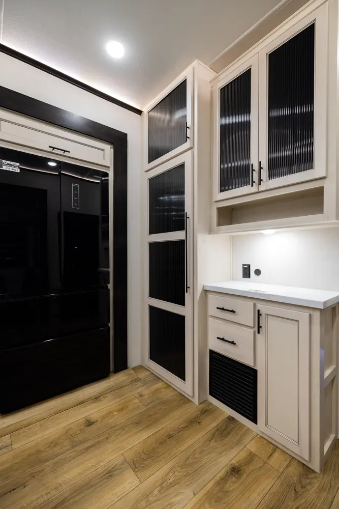 Discover the future of 5th wheel RV living with the Sabre Sundeck 33RLP by Forest River. This innovative RV features an industry-first retractable patio deck, extending your outdoor living space. Inside, you’ll find a L-shaped sectional, perfect for relaxation, and an impressive entertainment center complete with a fireplace. The fully equipped kitchen is a chef’s dream, boasting ample solid surface countertops, a residential-style oven, an air fryer microwave, and a 12-volt refrigerator.