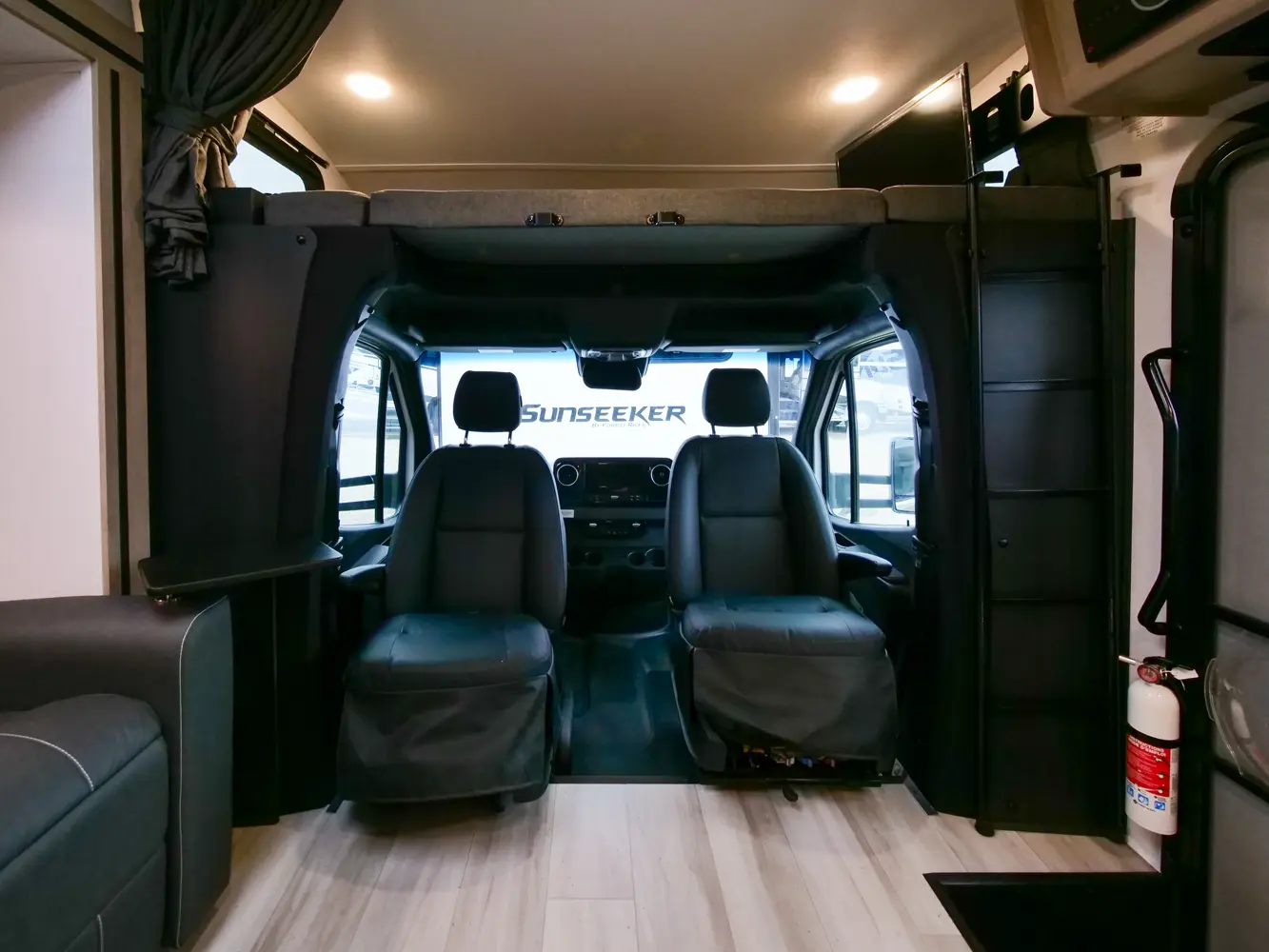 The 2400T is the perfect couple's coach, with a full rear bathroom, galley kitchen, and queen Murphy bed/sofa combo. There's a 54" x 80" cab over bunk for additional sleeping and storage space—or you can choose to add the optional Trekker cap with a built in entertainment center. This unit features a hidden storage area behind the 12V TV. And you never know when someone might sleep on the power theater seats. The 2400T is built on the Mercedes Benz Diesel 3500 chassis.
